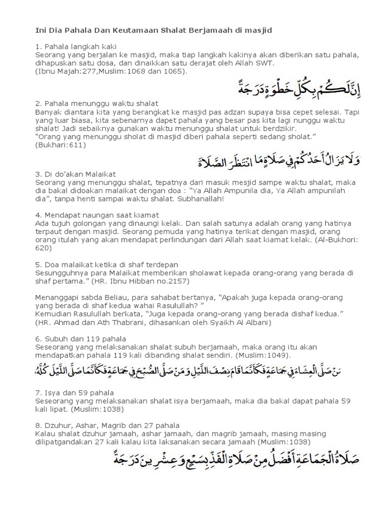 1 keutamaan shalat jamaah. Seandainya mereka mengetahui keutamaan yang terdapat dalam kedua shalat tersebut niscaya mereka akan mendatanginya meskipun dengan merangkak hr. Dan manusia yg paling besar pahalanya dlm.
